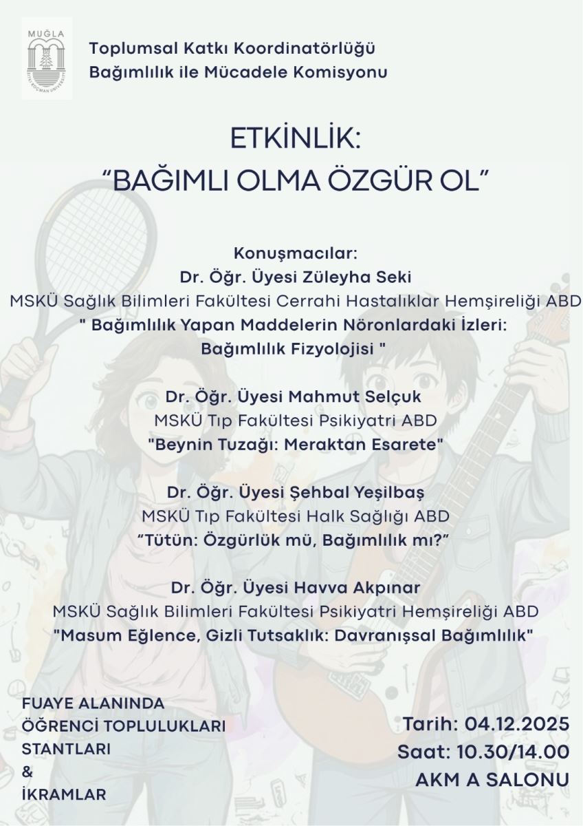 Üniversitemiz Toplumsal Katkı Koordinatörlüğü altında çalışmalarını sürdüren Bağımlılık ile Mücadele Komisyonu tarafından 4 Aralık 2025 Perşembe günü 10.30-14.00 saat aralığında Atatürk Kültür Merkezi A Salonunda "Bağımlı Olma Özgür Ol" etkinliği düzenlenecektir.
