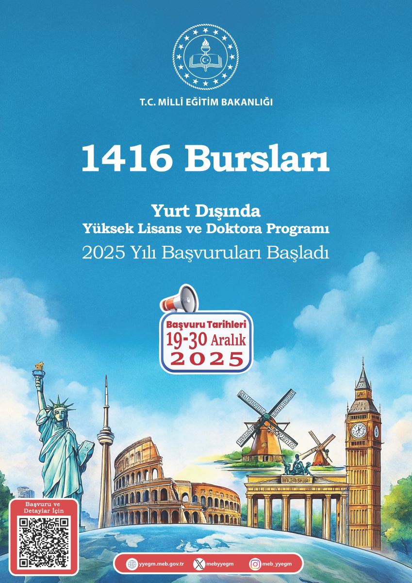 Milli Eğitim Bakanlığı 1416 Bursları Milli Eğitim Bakanlığının 1416 Burslarına ilişkin duyurusuna ve afişine aşağıdaki bağlantılardan ulaşabilirsiniz. Son Güncelleme : 29.12.2025 19:35 Okunma Sayısı : 7